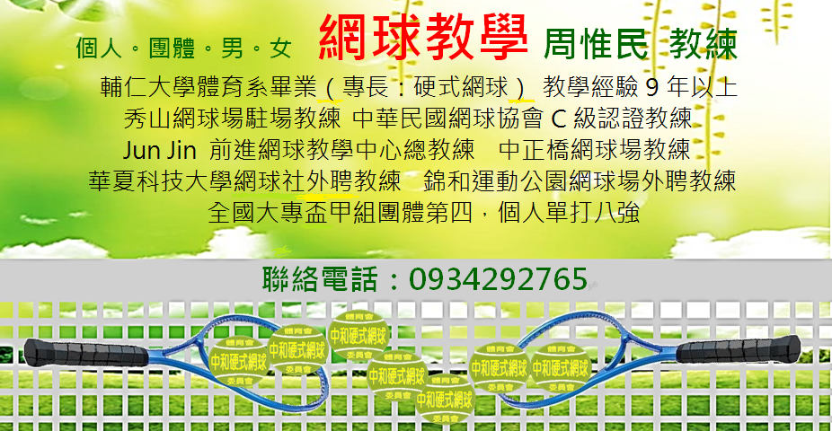 網球教練 周惟民 新北市年度挑戰盃TENNIS 網球賽 中和區體育會硬式網球委員會 體育署推動全民體育運動組織與法規 辦理具國際組織非亞奧運體育團體訪視計畫, 強化組織運作輔導。訂定輔導非具國際組織非亞奧運體育團體辦理活動經費審查機制, 以國際單項運動總會聯合會所屬,非亞奧運單項運動總會之會員運動種類為主之全民運動會 |